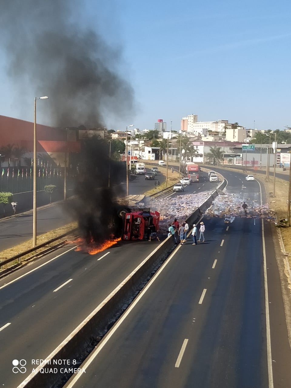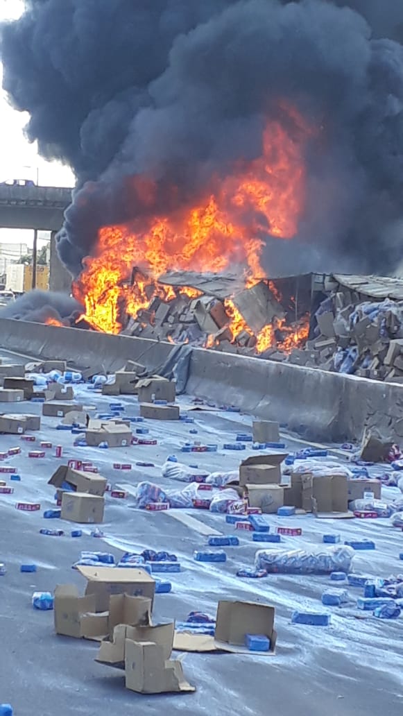 O veículo estava transportando uma carga de sabão, que ficou espalhada pela pista. A PRF está fazendo o controle do tráfego, enquanto o Corpo de Bombeiros (CB) realiza o controle das chamas.