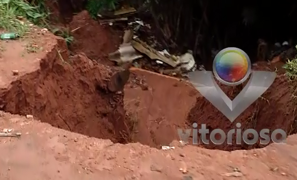 O primeiro deles, estava em uma curva na Avenida Holanda, próximo a uma pilha de entulho. Os moradores colocaram restos de móveis para identificar o problema a quem passa de carro ou moto no local.
