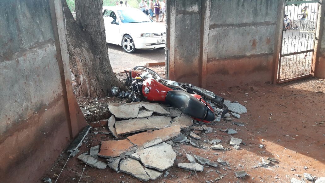 A motocicleta subiu na calçada e bateu em um muro, que quebrou, e depois numa árvore dentro de um terreno. O impacto foi forte. O capacete da vítima ficou amassado. Uma poça de sangue ficou no local.