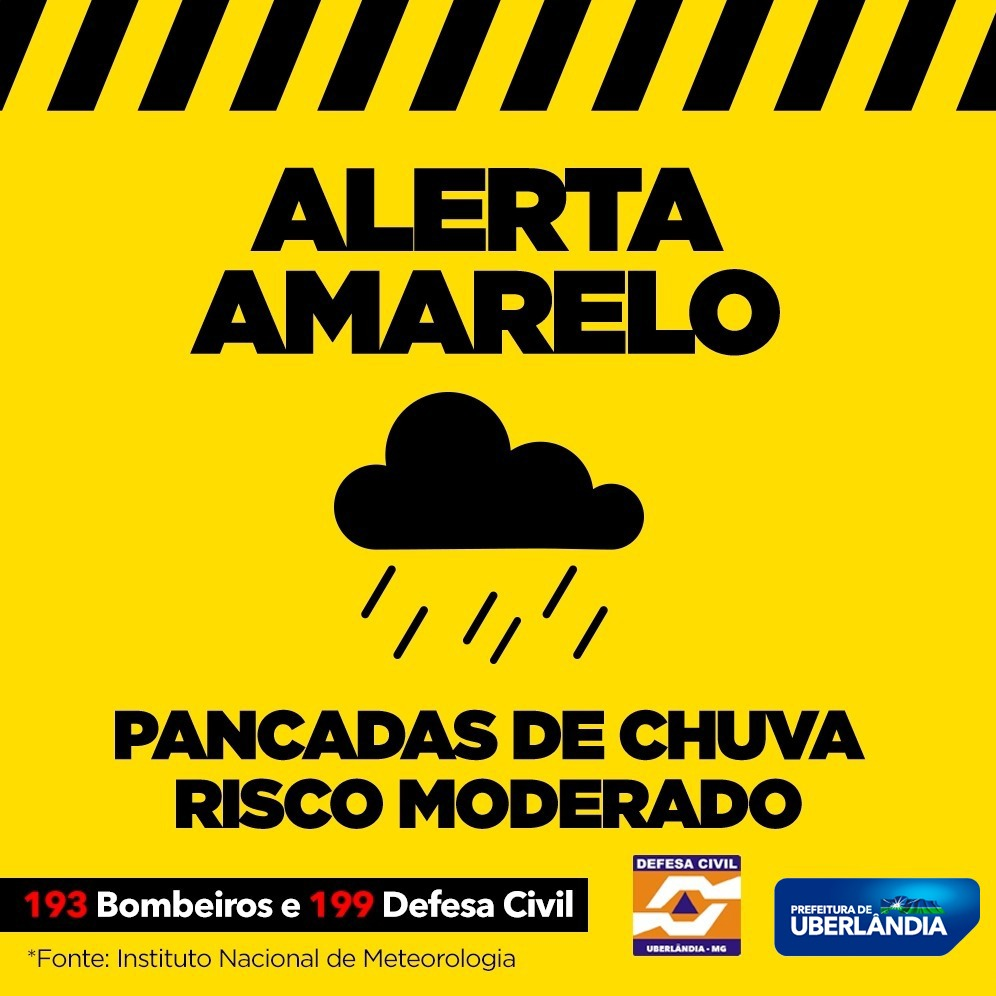 A cidade de Uberlândia está sob alerta amarelo emitido pela Coordenadoria Municipal de Proteção e Defesa Civil (Compdec). O órgão informa que o município tem possibilidade de chuva moderada a forte para as próximas horas desta segunda-feira (22).