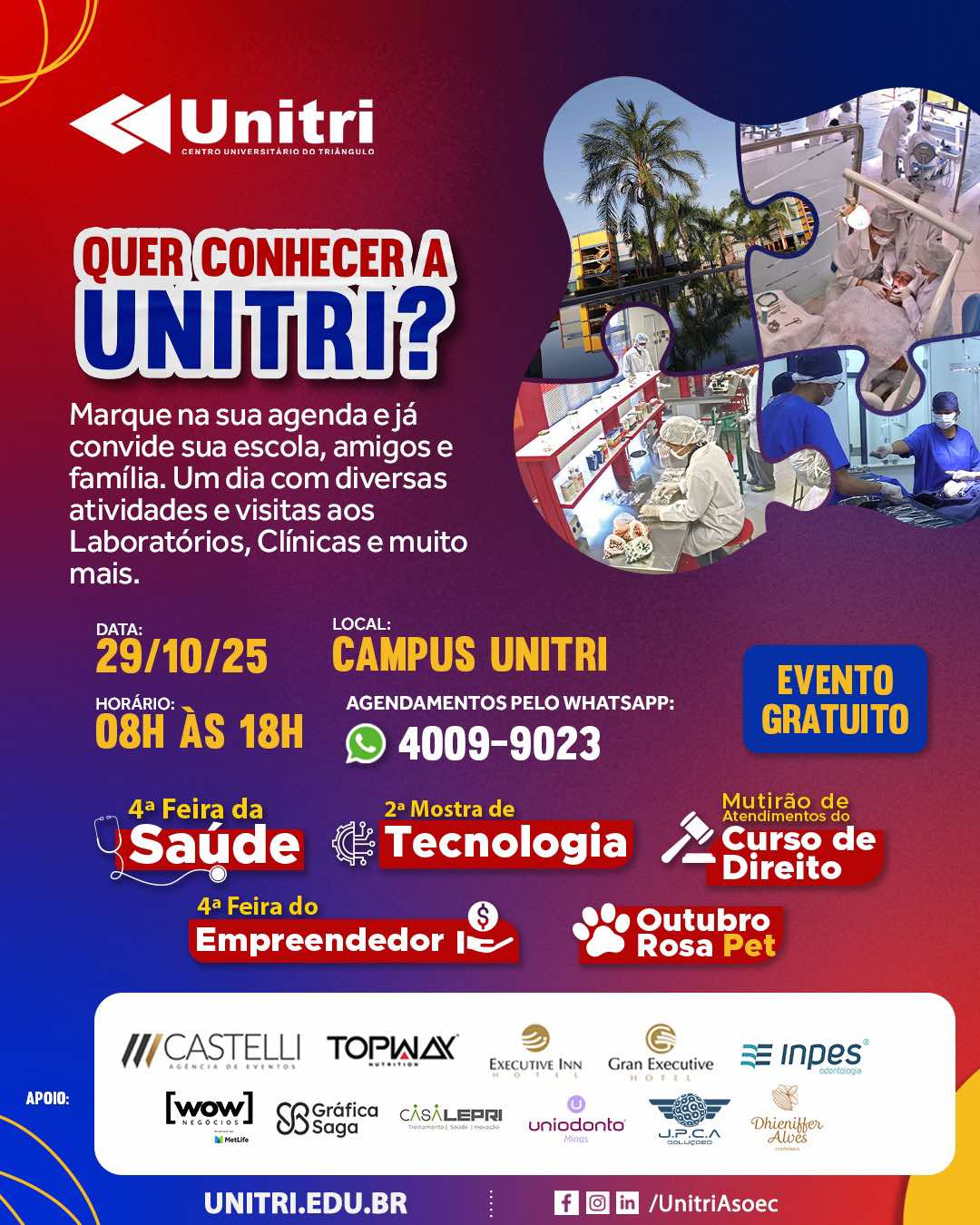 O Centro Universitário do Triângulo (UNITRI) realiza no dia 29 de outubro, das 08h às 18h, um evento voltado para quem deseja conhecer mais sobre cursos de graduação, mercado de trabalho e estrutura acadêmica da instituição. A programação será aberta à comunidade, com foco em alunos do ensino médio, pais, amigos e escolas da região.