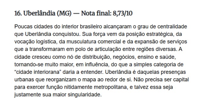Uberlândia foi classificada como a cidade mais feliz de Minas Gerais e a 16ª do Brasil. É o que apontou o ranking nacional de felicidade divulgado, no início deste mês, pela Revista Bula. De acordo com o estudo, o município atingiu nota 8,73, numa escala até 10. O levantamento, inspirado no World Happiness Report, da Organização das Nações Unidas (ONU), colocou Uberlândia entre as cidades brasileiras que oferecem as condições mais consistentes de bem-estar estrutural, baseado em dados públicos municipais auditáveis e comparáveis.