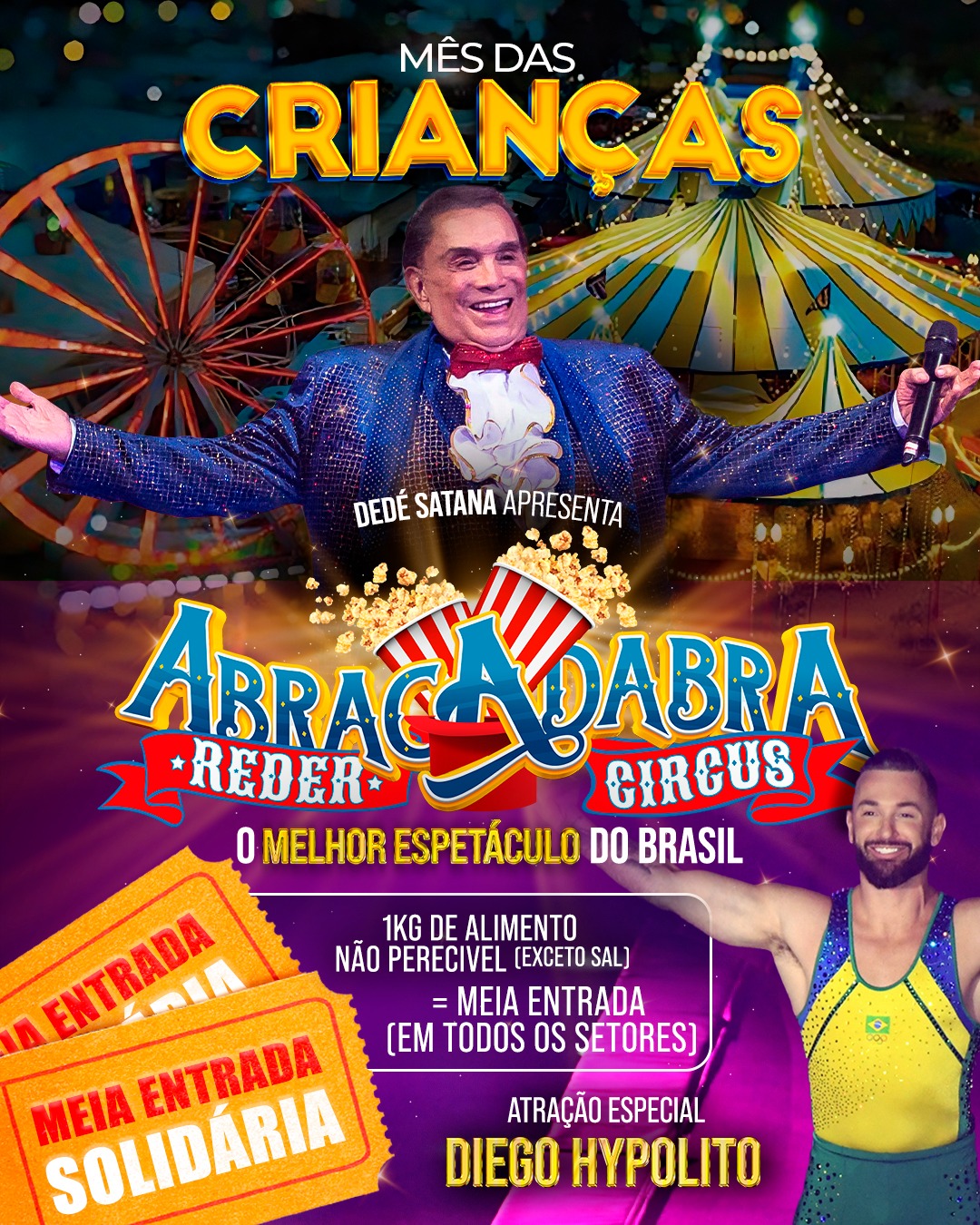 O Reder Circus se aproxima de suas últimas apresentações em Uberlândia e anuncia uma ação especial para o público: a Meia-Entrada Solidária. Em todos os setores, o espetáculo oferecerá 50% de desconto no valor do ingresso inteiro mediante a doação de 1 kg de alimento não perecível, que será destinado a instituições assistenciais da cidade.