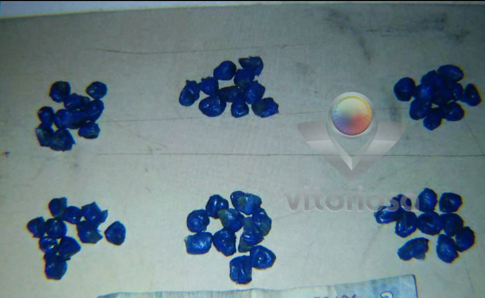 Ao perceber a presença da viatura, os suspeitos jogaram a sacola no chão. Os militares encontraram 30 pedras de crack, uma bucha de maconha e dinheiro trocado dentro de uma bolsa. A dupla foi identificada como Frank  Victor de Oliveira e Marlon Venâncio Silva.