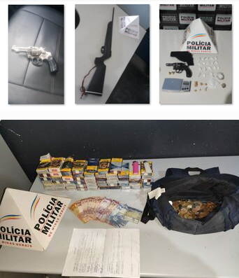 No total, foram apreendidas três armas, duas munições, uma balança de precisão, um coldre, 67 maços de cigarros furtados, 20 papelotes de cocaína pura, uma porção pequena da mesma substância, 89 pedras de crack, uma porção do mesmo entorpecentes esfarelado, 13 buchas de maconha esfarelada, um cigarro e um tablete da mesma substância.