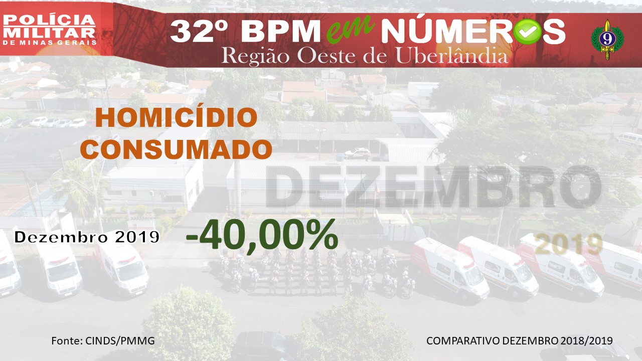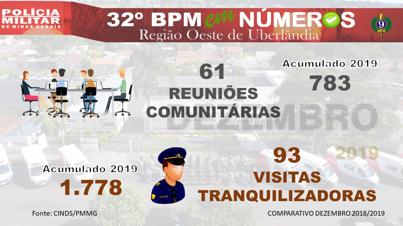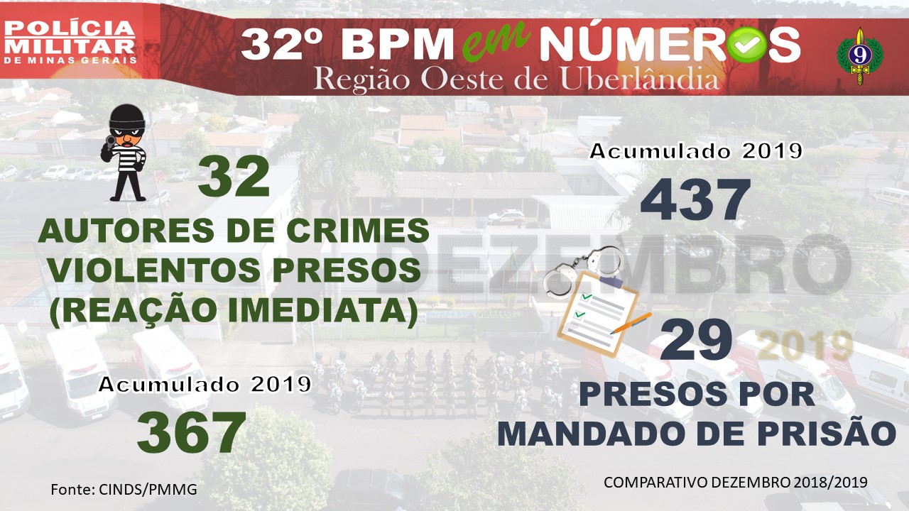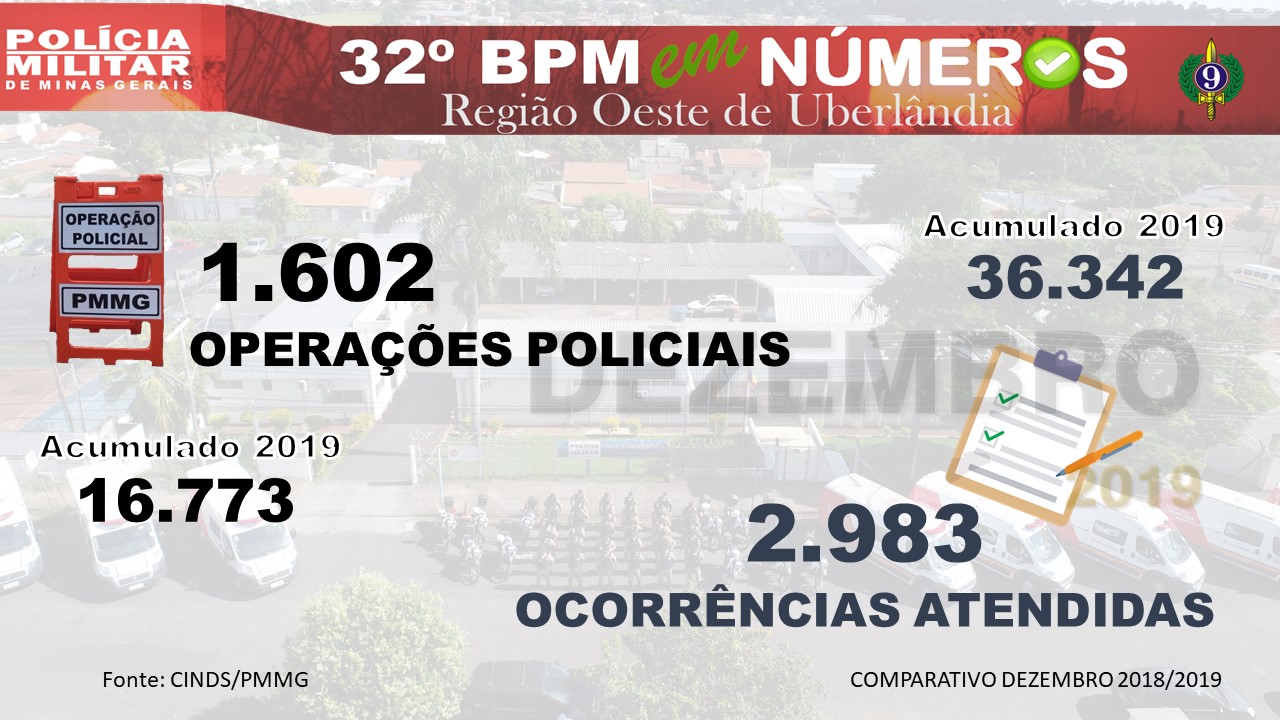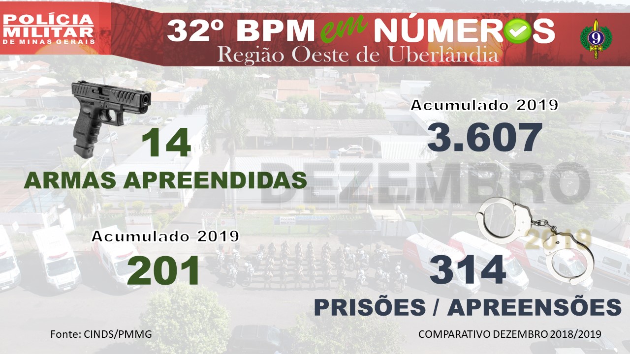 O 32º Batalhão da Polícia Militar (PM) divulgou na manhã desta terça-feira, 14, um balanço com o resultado do trabalho feito durante o ano de 2019 na zona oeste de Uberlândia, que inclui 19 bairros da cidade.