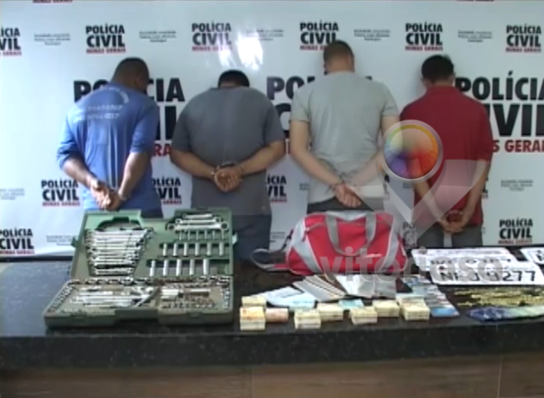 Os suspeitos Weber Henrique de Oliveira, de 41 anos, Mateus Garcia Guimarães, de 21 anos, Adonimar de Paula Gomes, de 43 anos, e Eder Freitas Borges, de 35 anos, foram presos em flagrante pelos crimes de receptação e associação criminosa.