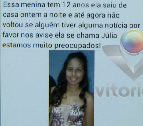 A família da adolescente registrou o boletim de ocorrência, e autorizou a TV Vitoriosa fazer a divulgação da foto da menor para ajudar encontrá-la.